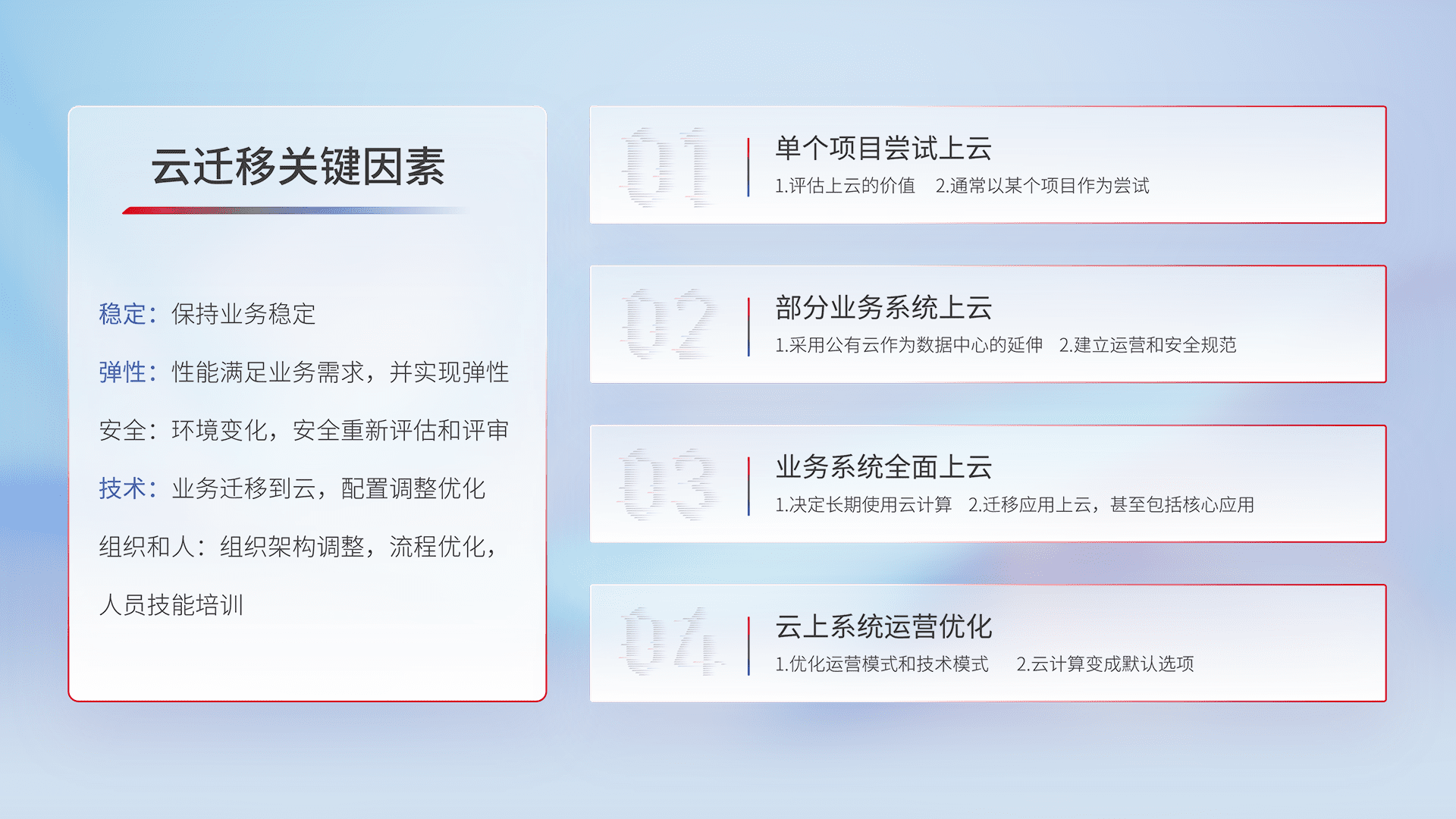 结合实际业务,,,从规划设计、、云平台选型、、、云原生改造、、、数据迁移、、、、集成交付,,迁移全过程为客户识别最佳上云路径,,做好风险识别管理,,设计网络架构、、、身份权限、、、安全审计合规、、、操作审计、、、日志审计、、、、监控告警策略、、、、多站点容灾设计等,,,对云上基础设施进行整体规划,,,提升IT治理水平,,,,以满足弹性、、高可用、、、、高性能的需求。。。。